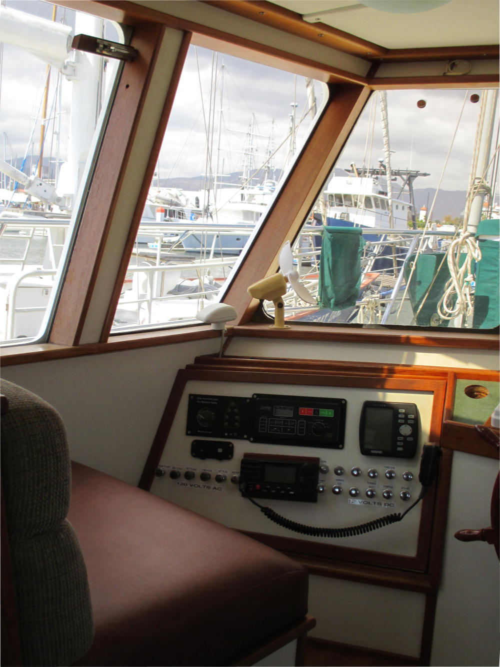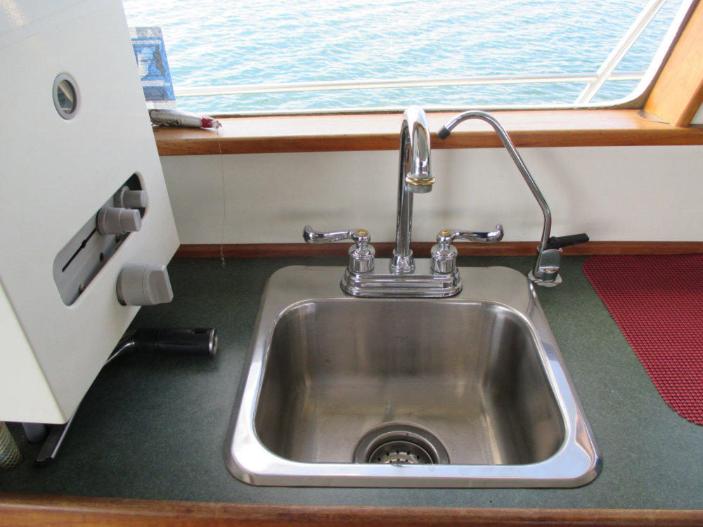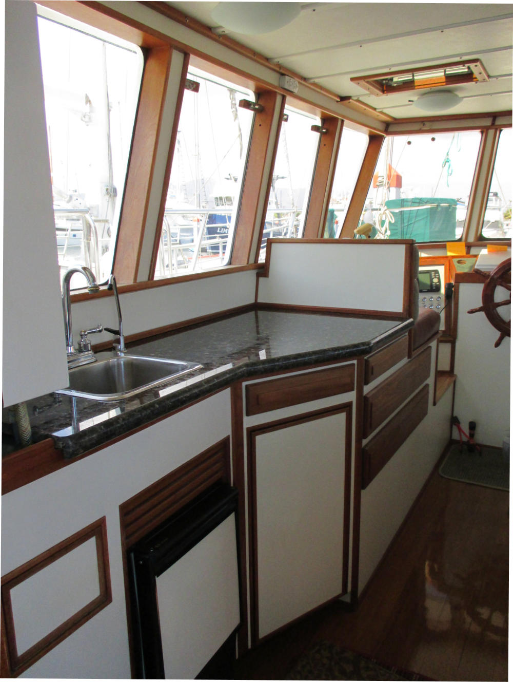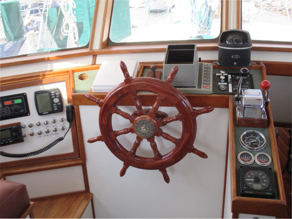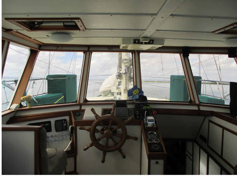 The Pilothouse is a real asset to Mo’Chuisle. It has 15 windows, 6 of which drop to open for ventilation and a full size opening door. It provides comfort and safety out of the wind and weather, as well as a 360 degree view from the inside. A good place to dine, breakfast, lounge, and socialize, or just hunker down when the weather is unpleasant.
