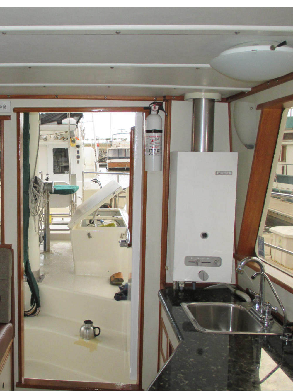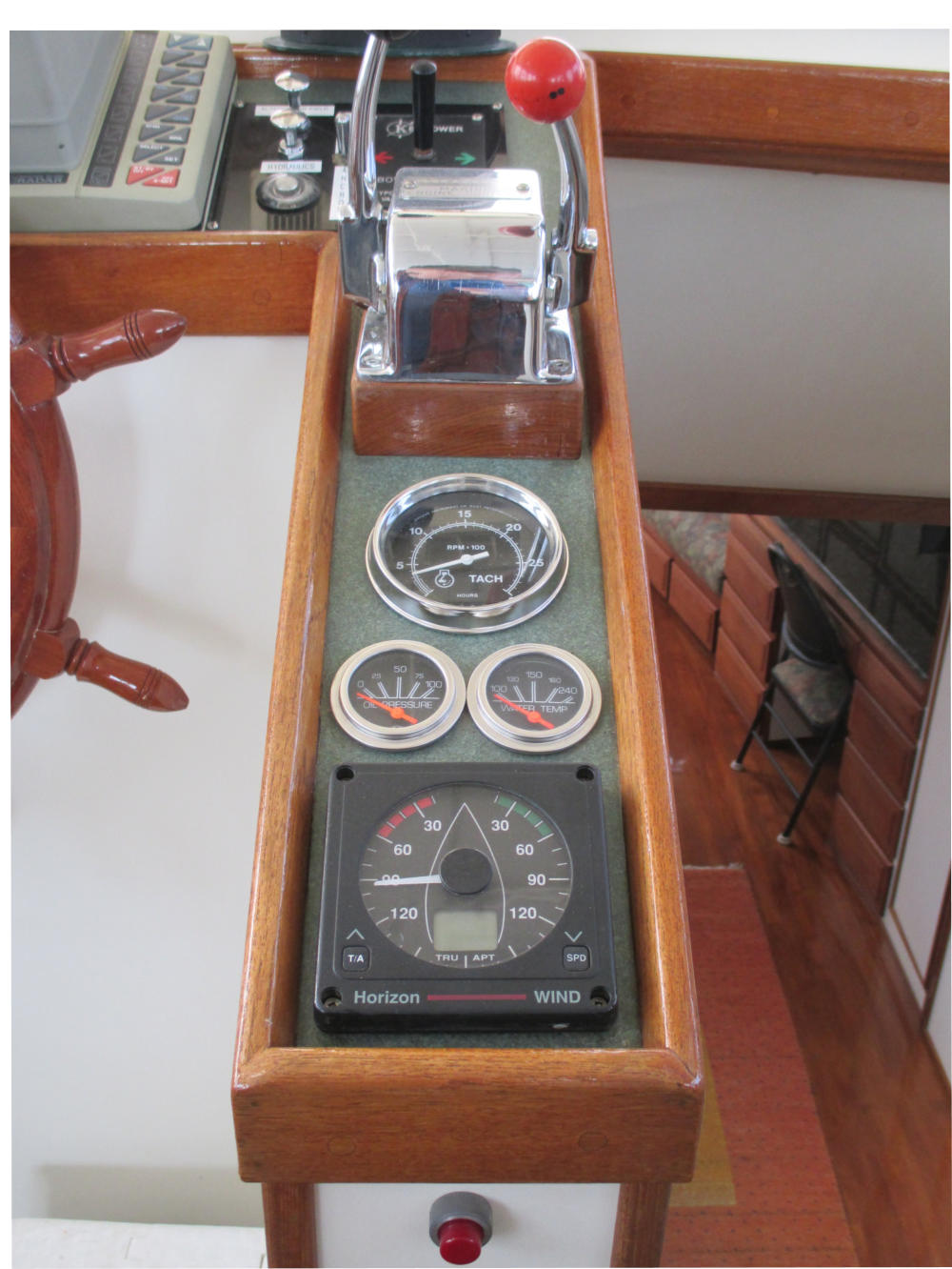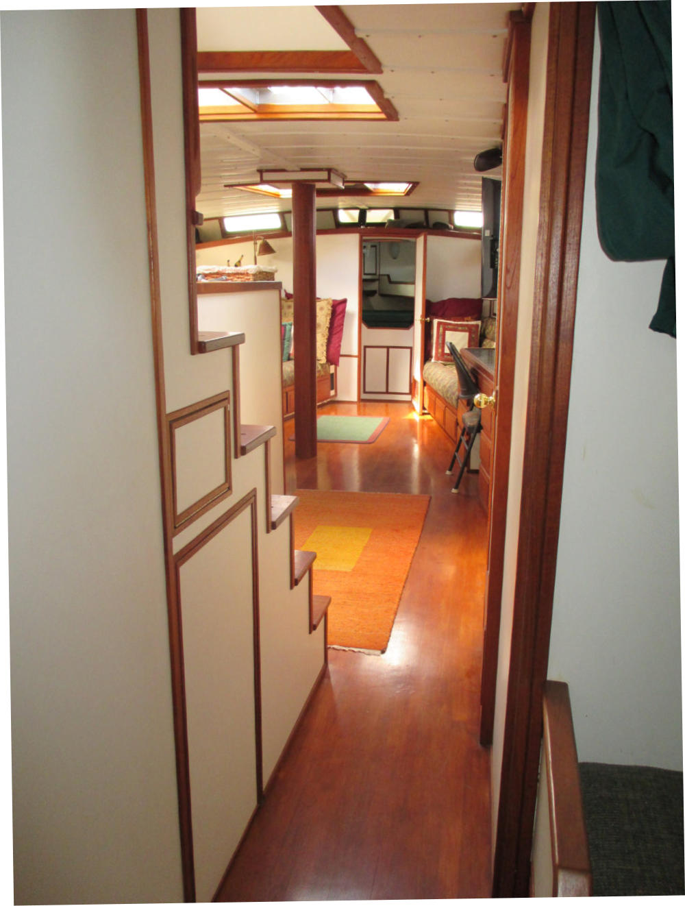 The Pilothouse is a real asset to Mo’Chuisle. It has 15 windows, 6 of which drop to open for ventilation and a full size opening door. It provides comfort and safety out of the wind and weather, as well as a 360 degree view from the inside. A good place to dine, breakfast, lounge, and socialize, or just hunker down when the weather is unpleasant.