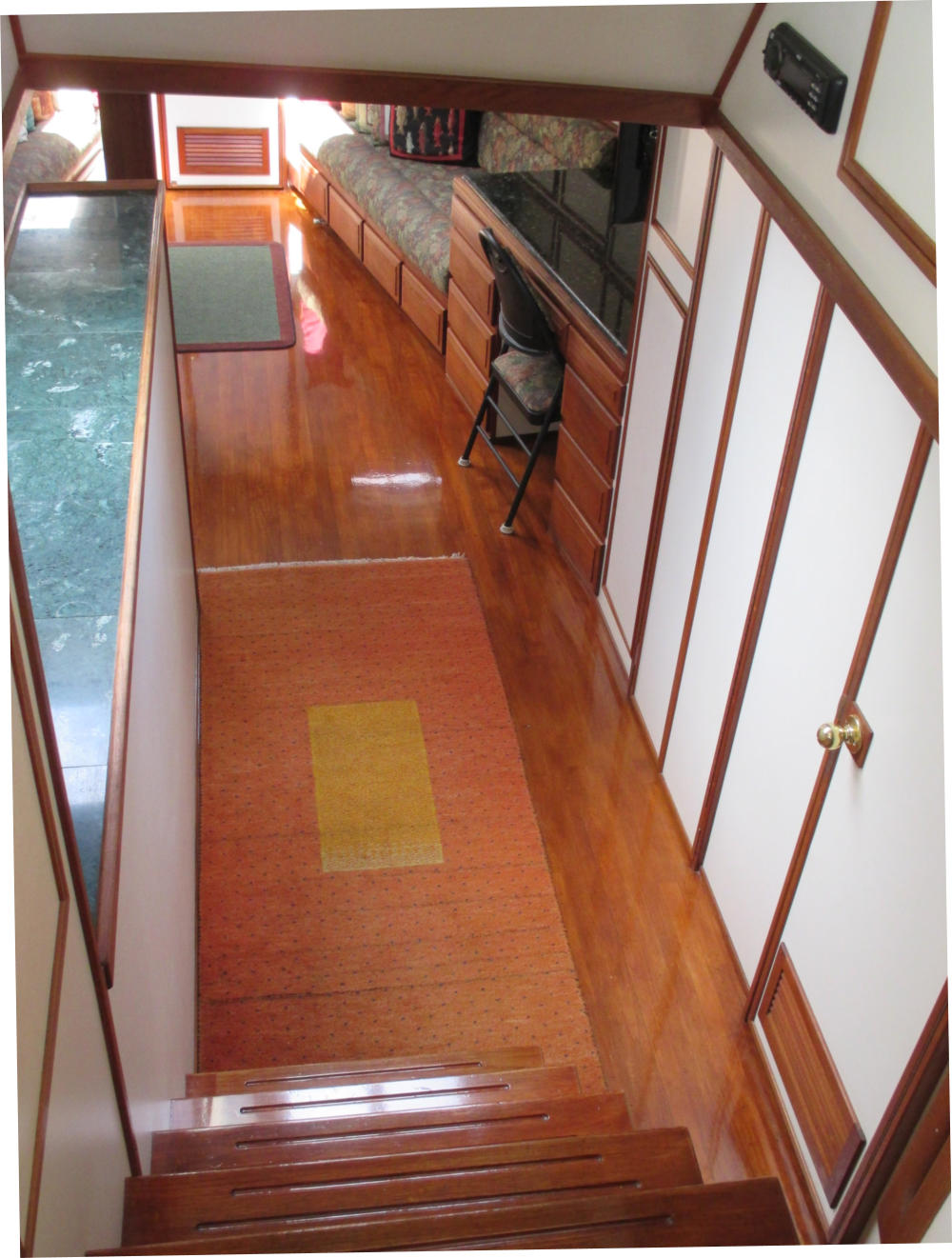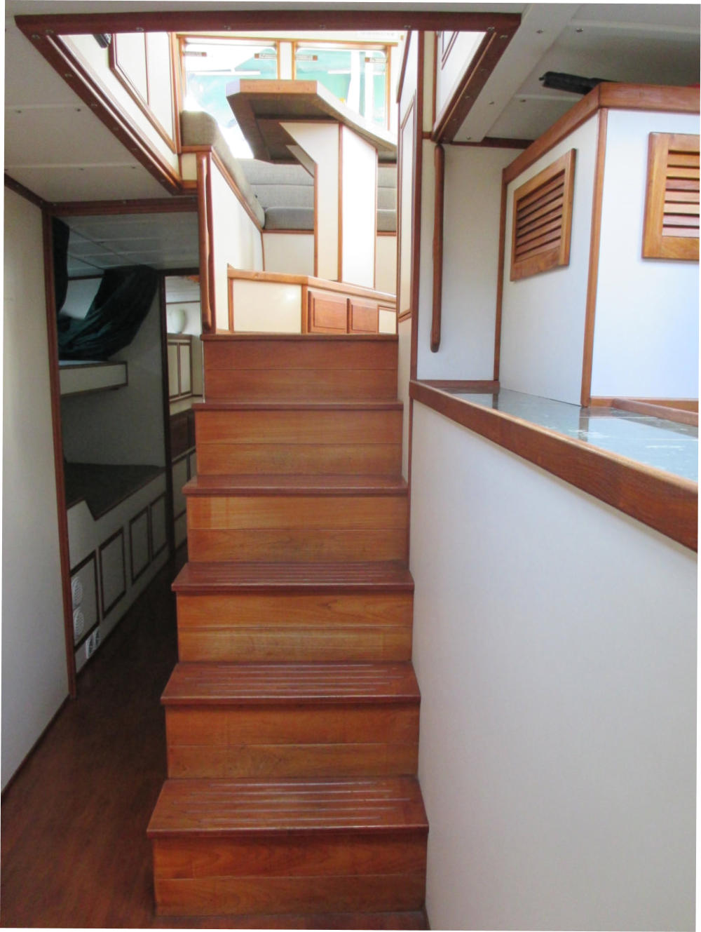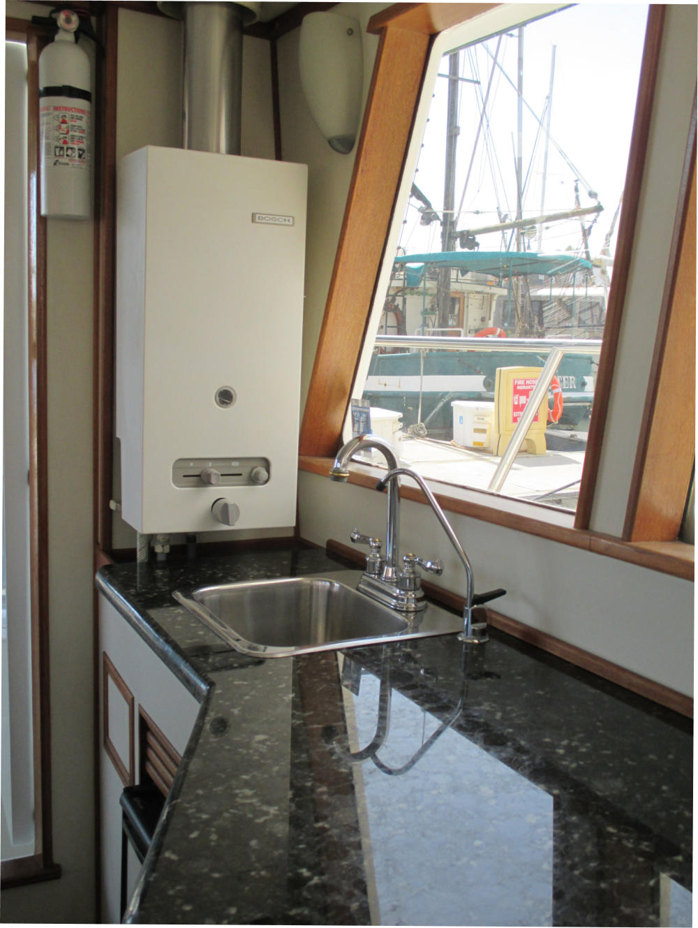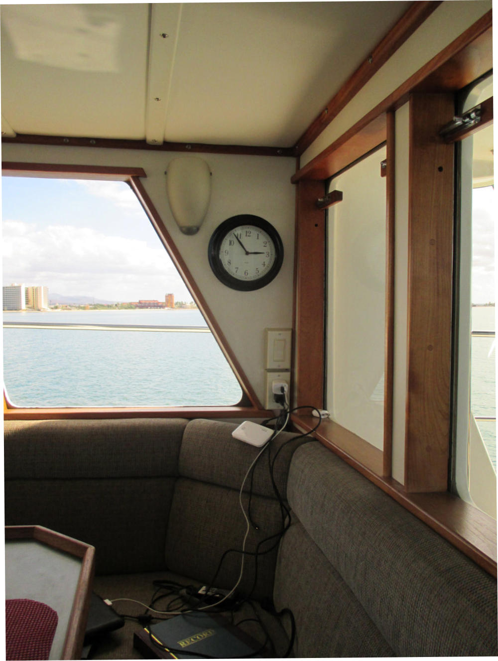 The Pilothouse is a real asset to Mo’Chuisle. It has 15 windows, 6 of which drop to open for ventilation and a full size opening door. It provides comfort and safety out of the wind and weather, as well as a 360 degree view from the inside. A good place to dine, breakfast, lounge, and socialize, or just hunker down when the weather is unpleasant.