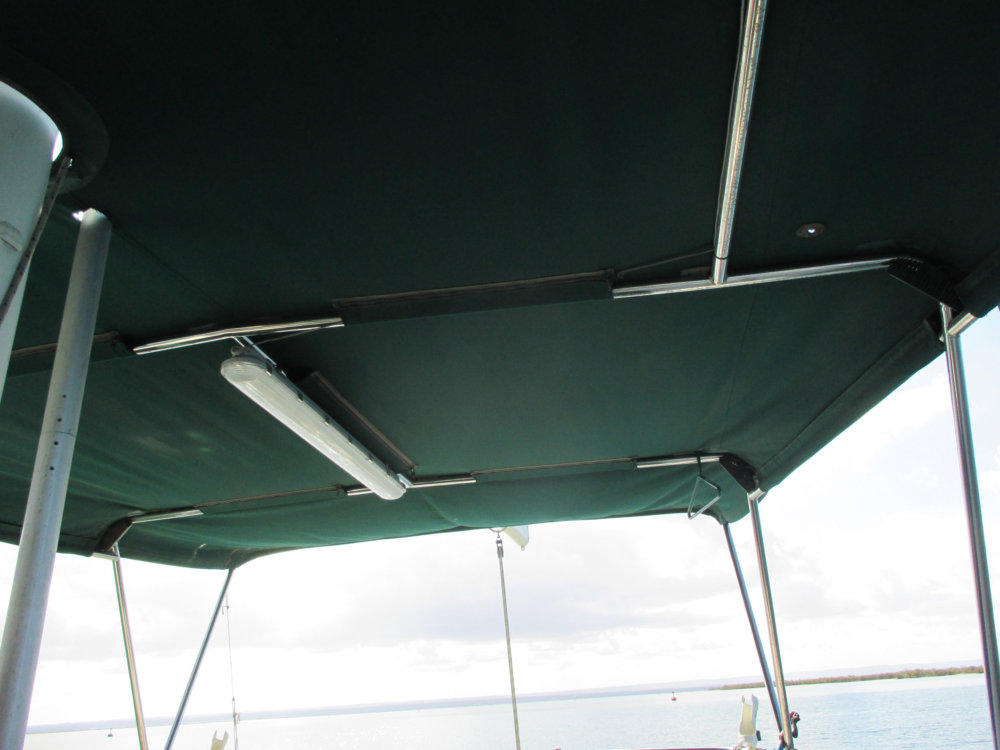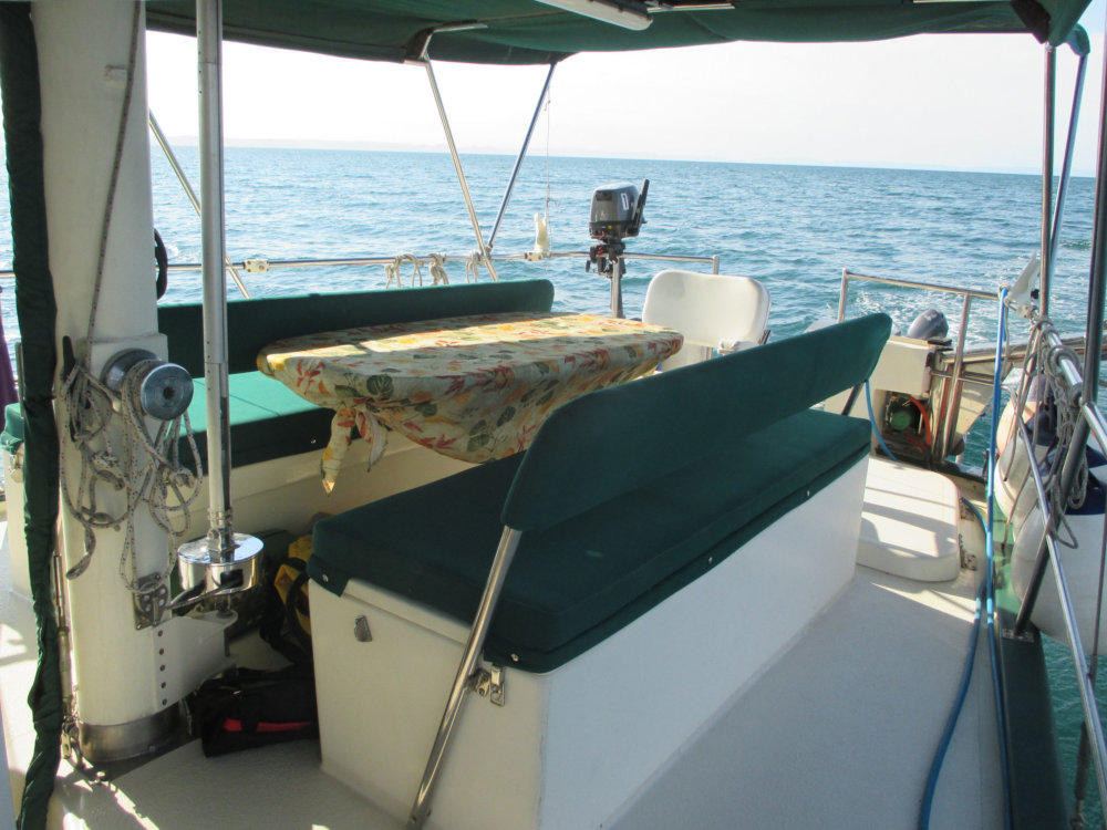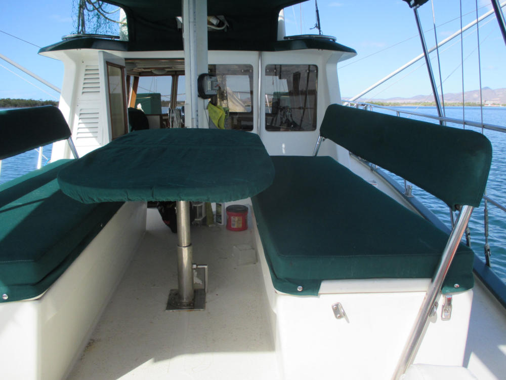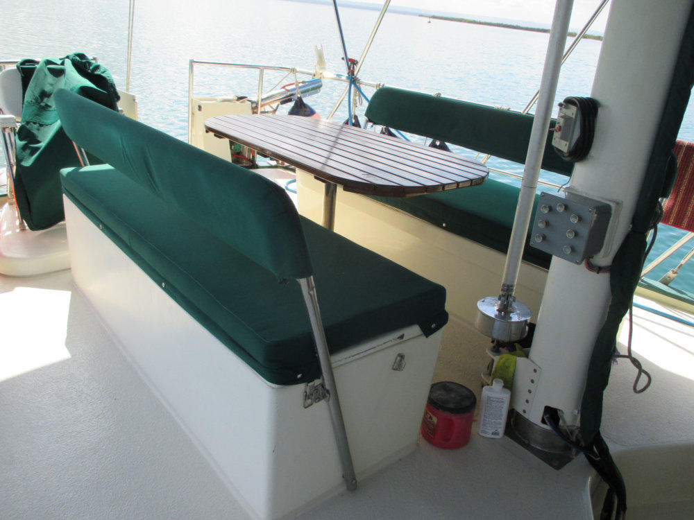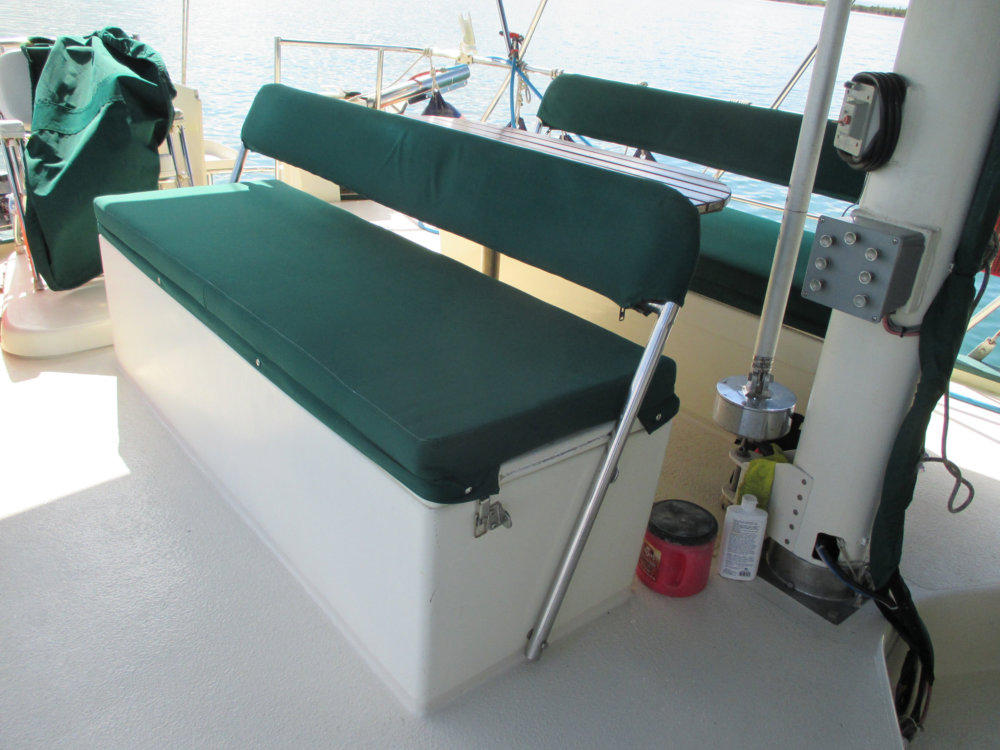 Aft DeckThe aft deck has two bench seat / storage lockers with a dining table in between. The backs of the seats, which are made of SS tubing can be positioned inboard or outboard depending on which side you choose to sit. The port side locker is for fishing rods while the starboard side lockers are for general storage. The table seats six and can swivel or be raised and lowered as needed. Aft of the table are two large deck hatches, which open to a self bailing water tight lazarette. There is with more storage below that. This large area holds the propane tanks, dive tanks and a Bauer diving compressor, and is used to store the small tender when it is deflated. It has a sealed 12 volt sub-panel to run the lights and pumps in the stern extension. There is a hatch-door that covers the stairs when not in use and makes it safer to walk when fishing.There are 7 led flood lights around the aft deck and a 48” led light over the table. There is a 120 volt outlet in a junction box on the mizzen mast.The aft deck is cover with a welded SS tubing and fabric canopy for providing shade. The farthest aft tube folds forward to provide a clear area overhead for rods when fishing.